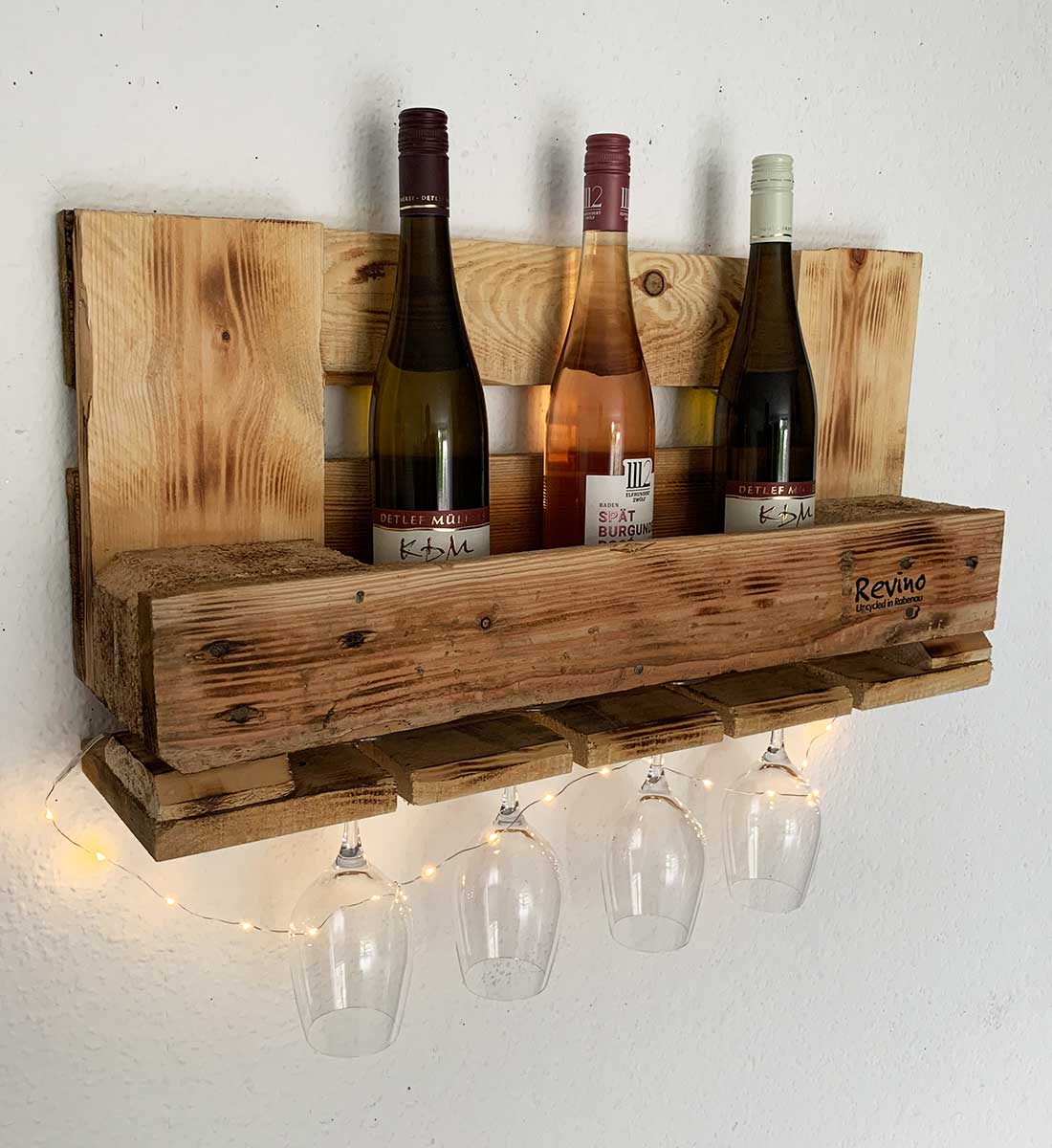 Dabei achten wir darauf, dass unsere hohen Standards erfüllt werden, und dennoch die einzigartige Charakteristik jeder Palette zum Vorschein kommt. Am Ende der Fertigung eines jeden Weinregals folgt die Bearbeitung mit Feuer, welches dem Regal den letzten optischen Schliff verpasst. Dann geht es auch schon weich verpackt in recyclebarem Verpackungsmaterial zu dir nach Hause. Nachhaltig, Zero Waste und klimaneutral dank CO2 Ausgleich."