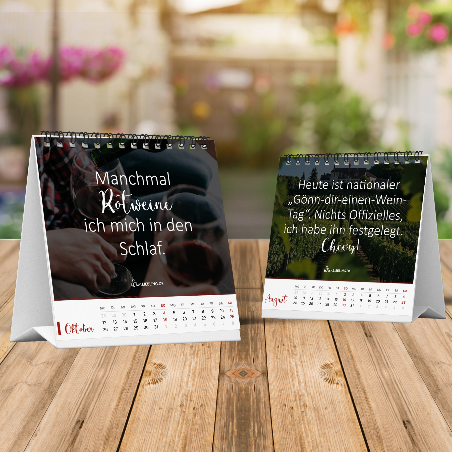 Das perfekte Geschenk für alle Weinfans mit Humor! 🤩 Unser WeinLIEBLING Tischkalender enthält auf 13 liebevoll gestalteten Seiten, die besten Weinsprüche des Jahres, extra für dich zusammengefasst. Jeden Monat erwartet dich ein neuer witziger Spruch, der dir Tag für Tag ein Lächeln ins Gesicht zaubern wird. Perfekt als Geburtstagsgeschenk, Weihnachtsgeschenk oder einfach als kleine Aufmerksamkeit für deinen liebsten Winebuddy oder für dich. 🥂