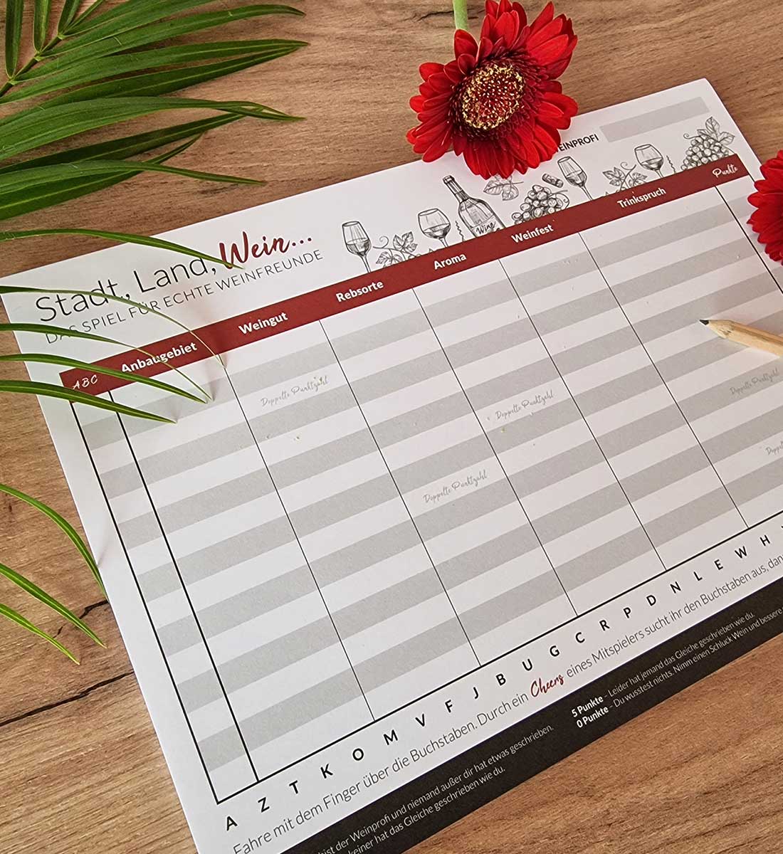 Der Abreißblock besteht aus 50 Seiten, somit könnt ihr das Weinspiel beliebig oft wiederholen und jedes Mal neues Weinwissen hinzugewinnen. Erarbeitet euch mit Spaß eure Punktzahl und feiert am Ende mit einem Glas Wein. 🍷